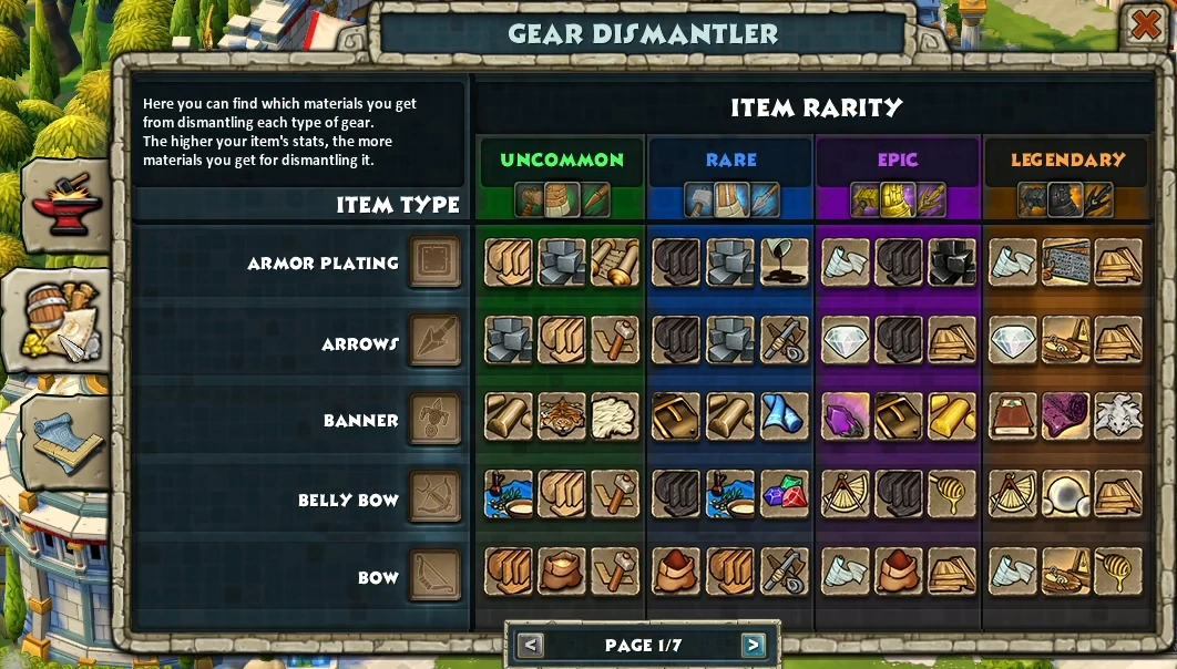 This is a special building found in the City of Rome that allows the player to get rid of useless or unworthy gear obtained in loot chests in return of materials at each dismantling. The color bar below will detect the quality of the process.