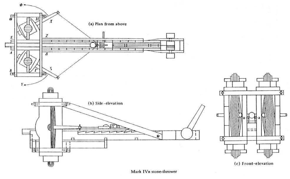 Detailed diagrams of a gigantic palintonon (παλίντονον), around 334 BC (siege of Halicarnassos), probably by E.W. Marsden. The palintonon was a Hellenic heavy catapult, mostly stone-throwing, which was constructed in various scales (from just heavy to enormous). It was invented and intensively used by the Greeks in the early or mid-4th century BCE but it was soon adopted by the Carthaginians, the Romans and other ancient states. It became a ‘beloved’ weapon for the Republican and Imperial Romans: they called it ‘ballista’, but the correct initial version was ‘ballistra’ (βαλλίστρα), also a Greek term from the verb ‘βάλλω’ that is “to shoot”.