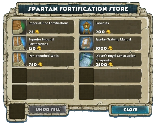 The Sparta Fortification Store sells different Equipment for different amounts of Coin. The equipment are all Rare.
